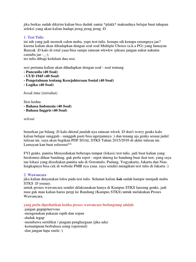 Ada tiga bagian utama yang diujikan dalam tiu, yaitu kemampuan verbal. Kaya gue nih misalkan, karna gue anak kabaret gue liatin akting dan kebetulan waktu itu. Now, saya akan share soal dan sedikit pengalam pra test salah. Soal tes akademik pmb stks 2014.2015 2. Buat kalian yang belum tahu stks bandung, silahkan di baca yaa guysss sekolah tinggi kesejahteraan sosial (stks) bandung merupakan lembaga.